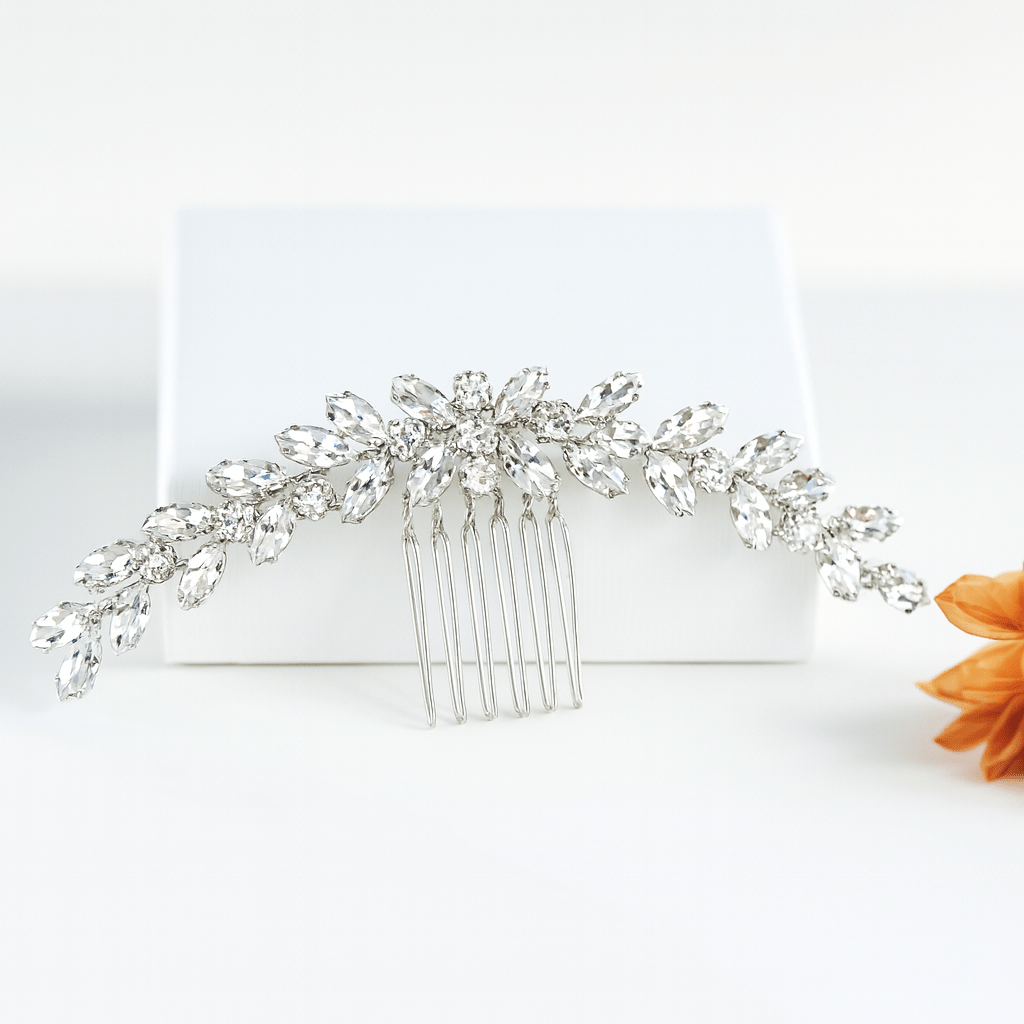 Platin Silber Hochzeitskamm mit geschwungenem Marquis Kristall Design aus brillanten, klaren Kristallen in einer echten platinierten Fassung.