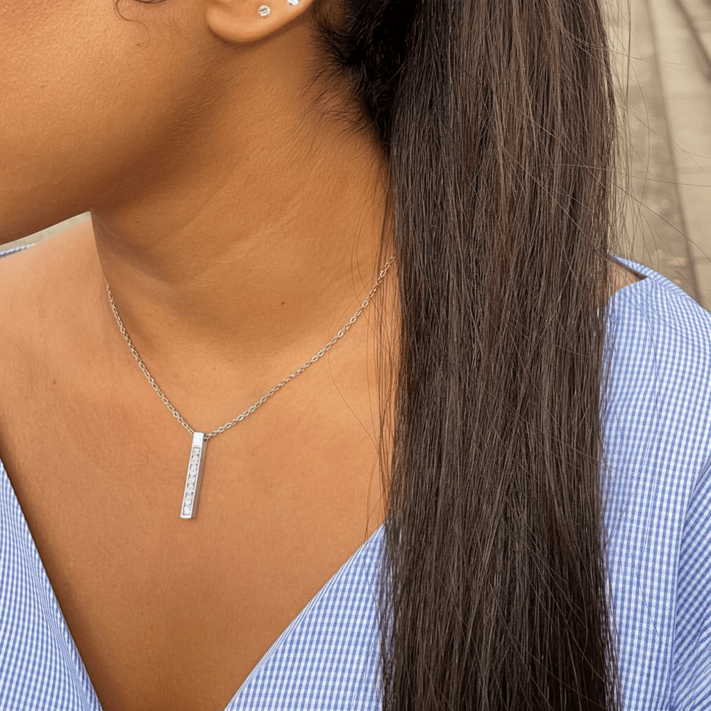 Diese edle Halskette aus hochwertigem Edelstahl überzeugt durch ihr minimalistisches Design und den modernen Stabanhänger, der mit funkelnden Zirkonia-Steinen besetzt ist. Die gesamte Kette – inklusive des schmalen, länglichen Anhängers – ist hochglanzpoliert und wirkt dadurch besonders clean und elegant.