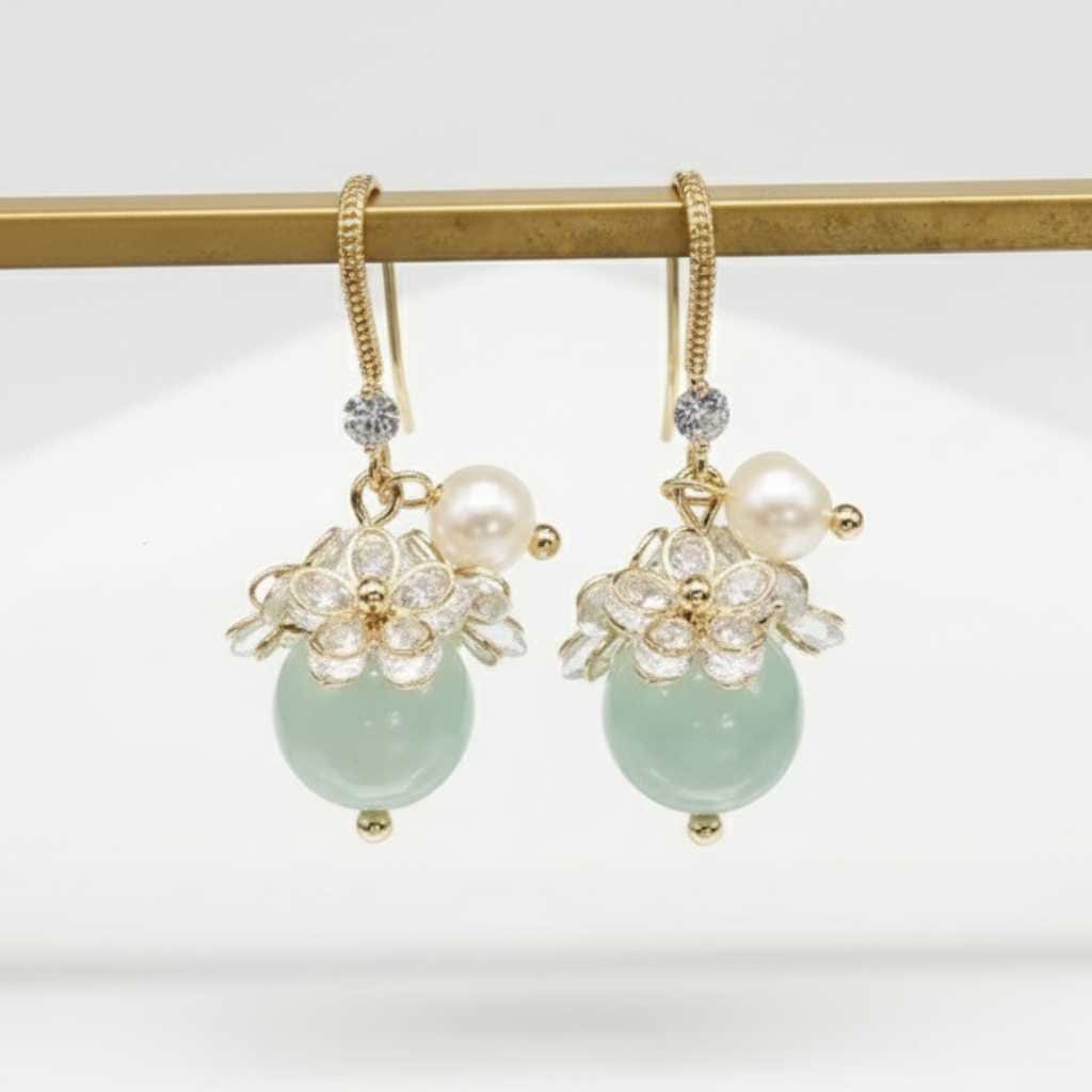 Bezaubernde Tropfen-Ohrringe mit 18 Karat vergoldet. Der aufwändig gearbeitete, romantische Ohrhänger ist verziert mir einem kleinen Zirkonia und einem Blüten besetzten runden Anhänger, wahlweise mit Jadestein oder mit Perle.