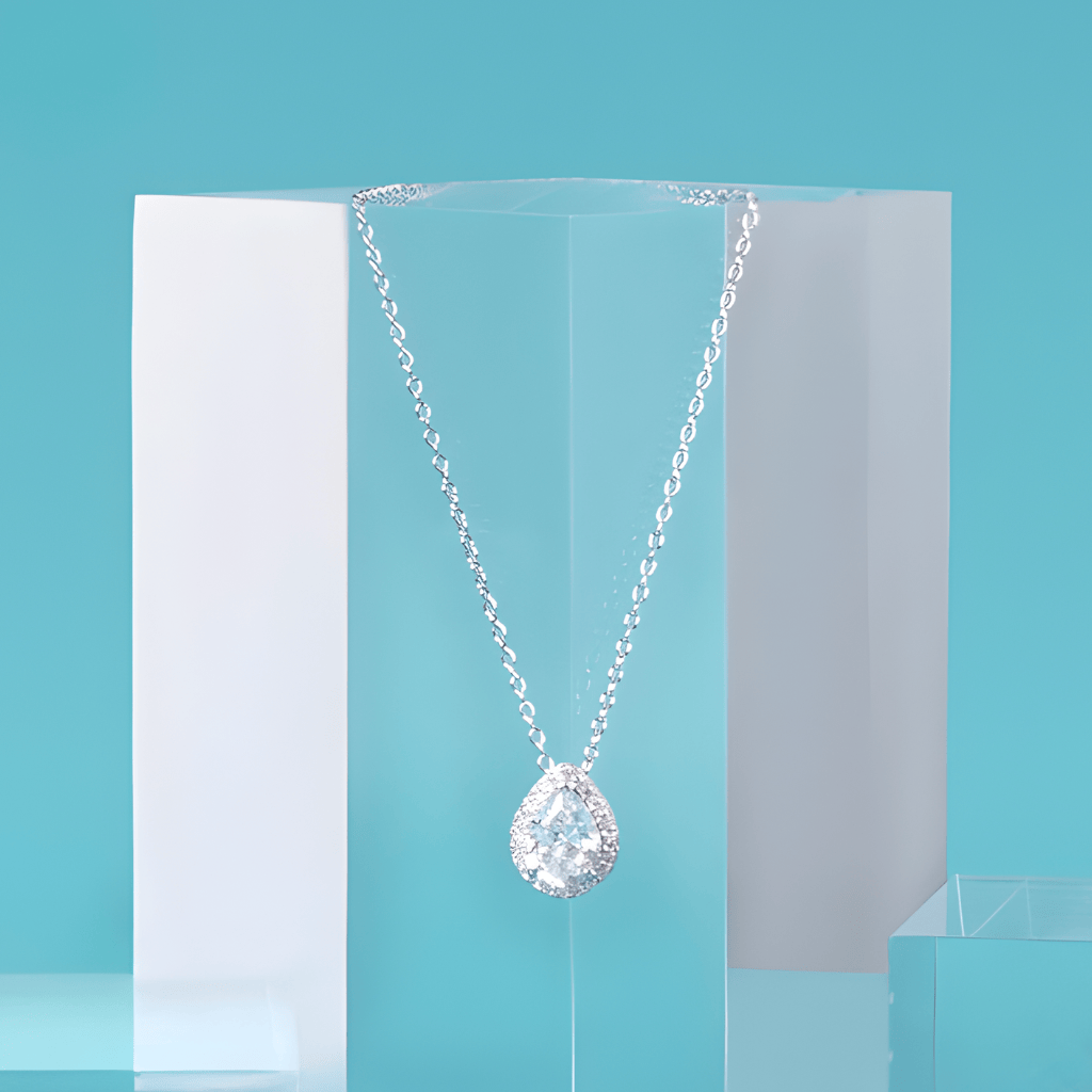 Das Herzstück dieser Halskette ist ein strahlender, tropfenförmiger Anhänger, der mit einem Zirkonia-Stein besetzt ist.